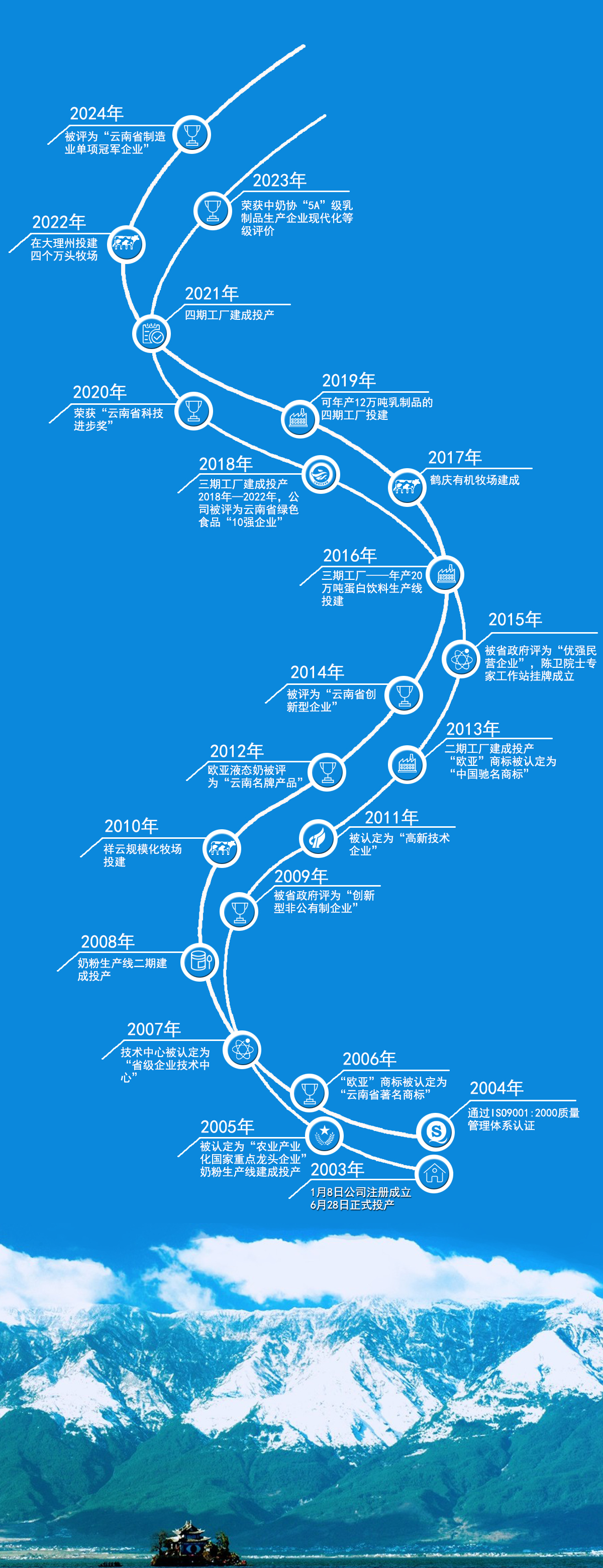 云南歐亞乳業(yè)有限公司,于2003年在云南大理注冊成立,20年來(lái),公司始終致力于為消費者奉獻更具特色、更加生態(tài)、更高品質(zhì)的云南高原綠色優(yōu)質(zhì)乳品,經(jīng)過(guò)不懈努力,歐亞乳業(yè)在綠色優(yōu)質(zhì)奶源基地打造、工廠(chǎng)數字化改造升級、高原特色乳品研發(fā)、綠色乳業(yè)品牌塑造、線(xiàn)上線(xiàn)下市場(chǎng)拓展等方面取得了顯著(zhù)成效,逐步發(fā)展為省內規模較大、銷(xiāo)售額較高、品牌影響力較強、產(chǎn)品深受消費者喜愛(ài)的乳業(yè)龍頭企業(yè),獲得“農業(yè)產(chǎn)業(yè)化國家重點(diǎn)龍頭企業(yè)”“國家知識產(chǎn)權優(yōu)勢企業(yè)”、中國奶業(yè)“D20”企業(yè)、“云南省百戶(hù)優(yōu)強民營(yíng)企業(yè)”、2018年—2022年云南省綠色食品“10強企業(yè)”等百余項榮譽(yù),“歐亞”商標被評為“中國馳名商標”。