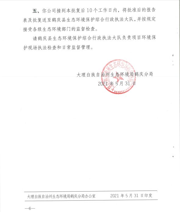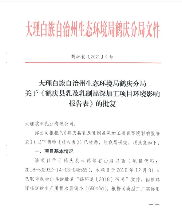 (一)大理白族自治州生態(tài)環(huán)境局鶴慶分局關(guān)于《鶴慶縣乳及乳制品深加工項目環(huán)境影響報告表》的批復